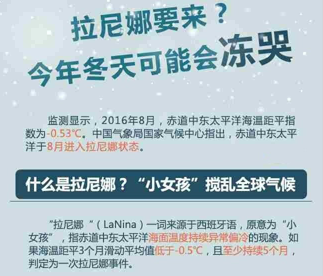 原來(lái),目前赤道中東太平洋已進(jìn)入拉尼娜狀態(tài),并可能發(fā)展成一次拉尼娜事件,和厄爾尼諾一樣,這個(gè)小女孩會(huì)攪亂全球氣候,但影響卻與厄爾尼諾相反,容易造成我國(guó)冬季氣候偏冷,容易出現(xiàn)冷冬。